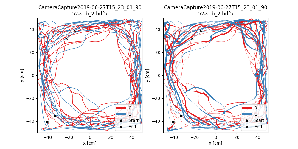 def plot( self, ax=None, lw_distances=False, lw=2, ms=32, figsize=None, step_size=4, c=None, cmap="Set1", skip_timesteps=0, max_timesteps=None, show=False, legend=True, ): """Plot the file using matplotlib.pyplot The tracks in the file are plotted using matplotlib.plot(). Args: ax (matplotlib.axes, optional): An axes object to plot in. If None is given, a new figure is created. lw_distances (bool, optional): Flag to show the distances between individuals through line width. figsize (Tuple[int], optional): Size of a newly created figure. step_size (int, optional): when using lw_distances, the track is split into sections which have a common line width. This parameter defines the length of the sections. c (Array[color_representation], optional): An array of colors. Each item has to be matplotlib.colors.is_color_like(item). cmap (matplotlib.colors.Colormap, optional): The colormap to use skip_timesteps (int, optional): Skip timesteps in the begining of the file max_timesteps (int, optional): Cut of timesteps in the end of the file. show (bool, optional): Show the created plot. Returns: matplotlib.axes: The axes object with the plot. """ if max_timesteps is not None: poses = self.entity_positions[ :, skip_timesteps : max_timesteps + skip_timesteps ] else: poses = self.entity_positions[:, skip_timesteps:] if lw_distances and poses.shape[0] < 2: lw_distances = False if lw_distances: poses_diff = np.diff(poses, axis=0) # Axis 0 is fish distances = np.linalg.norm(poses_diff, axis=2) min_distances = np.min(distances, axis=0) # Magic numbers found by trial and error. Everything above 15cm will be represented as line width 1 max_distance = 10 max_lw = 4 line_width = ( np.clip(max_distance - min_distances, 1, max_distance) * max_lw / max_distance ) else: step_size = poses.shape[1] cmap = cm.get_cmap(cmap) x_world, y_world = self.world_size if figsize is None: figsize = (8, 8) if ax is None: fig, ax = plt.subplots(1, 1, figsize=figsize) if self.path is not None: ax.set_title("\n".join(wrap(Path(self.path).name, width=35))) ax.set_xlim(-x_world / 2, x_world / 2) ax.set_ylim(-y_world / 2, y_world / 2) for fish_id in range(poses.shape[0]): if c is None: this_c = cmap(fish_id) elif isinstance(c, list): this_c = c[fish_id] timesteps = poses.shape[1] - 1 for t in range(0, timesteps, step_size): if lw_distances: lw = np.mean(line_width[t : t + step_size + 1]) ax.plot( poses[fish_id, t : t + step_size + 1, 0], poses[fish_id, t : t + step_size + 1, 1], c=this_c, lw=lw, ) # Plotting outside of the figure to have the label ax.plot([550, 600], [550, 600], lw=5, c=this_c, label=fish_id) # ax.scatter( # [poses[:, skip_timesteps, 0]], # [poses[:, skip_timesteps, 1]], # marker="h", # c="black", # s=ms, # label="Start", # zorder=5, # ) ax.scatter( [poses[:, -1, 0]], [poses[:, -1, 1]], marker="x", c="black", s=ms, label="End", zorder=5, ) if legend and isinstance(legend, str): ax.legend(legend) elif legend: ax.legend() ax.set_xlabel("x [cm]") ax.set_ylabel("y [cm]") if show: plt.show() return ax def render(self, video_path=None, **kwargs)-